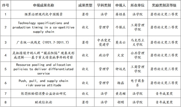 近日,教育部公布了第九届高等学校科学研究优秀成果奖(人文社会科学)获奖名单。华南理工大学共有8项成果获奖,获奖总数位于E9高校前列,其中包括著作论文奖二等奖2项、三等奖4项,青年成果奖2项。