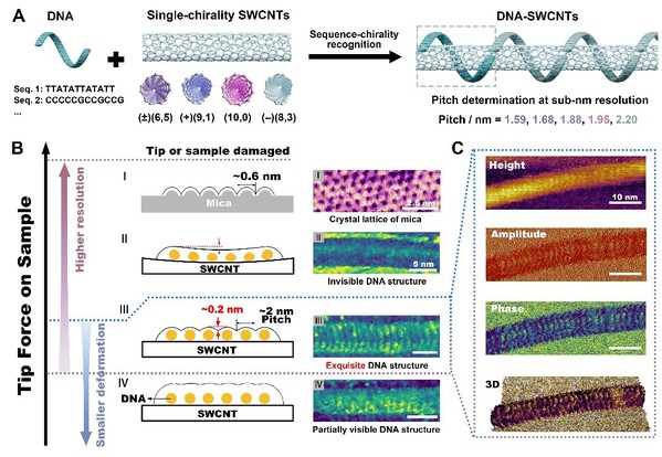 为了解决上述难题,林志伟教授团队采用了极软的探针,以小振幅、高频率对探针施加给样品的力进行了精准调节,成功避免DNA-SWCNTs形变,并获得高分辨率的DNA构象信息,首次在实验上实现了DNA-SWCNTs结构的精确解析。