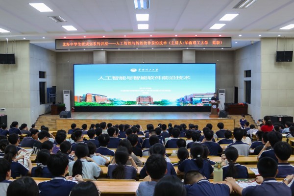 开展招生宣传的同时,学校也传递前沿科技进展。软件学院蔡毅教授为北海中学带来了《人工智能与智能软件前沿技术》专题讲座,科学技术研究院蒋兴华研究员以《科技创新与强国建设》为题,先后在平南县中学、浔州高级中学作科普讲座。讲座帮助同学们对人工智能应用前景、科技创新成果有了全新认识和理解,鼓励他们在未来学业中开展科学探索。